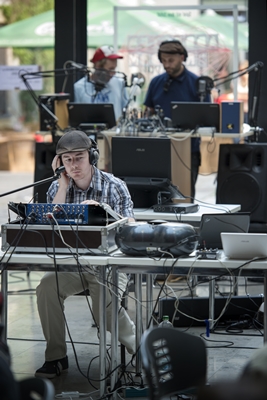 Im Gegensatz zu traditionellen Konzertmomenten, in welchen die Aufführung für spätere Übertragungen im Radio aufgezeichnet wird, ist »Imaginary Radio Band No. 1« eine radiophone Übertragung auf CORAX, deren tatsächlicher Zeuge allein das Publikum werden kann: Das Publikum erlebt die ständige Interaktion zwischen den Musiker_innen, dem Radioprogramm, akustischen Musikinstrumenten (wie der Barockorgel des Händel-Hauses) und den Computern. »Imaginary Radio Band No.1« gibt dadurch Blicke auf den Kompositionsprozess und den sonst eher unsichtbaren Aktionsraum der Radioproduktion frei.
