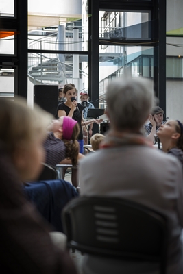Die Musiker_innen dieses Ensembles sitzen mit ihren Laptops im Publikum und werfen sich über ein Netzwerk in Echtzeit programmierte SuperCollider-Codes zu. Sie ergänzen die einzelnen Soundschnipsel, fügen sie jenen der anderen Programmierer hinzu oder dekomponieren sie in ihre Einzelbestandteile.